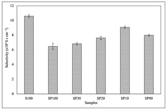 Selectivity is a measure of how well a membrane balances its proton conductivity and methanol permeability. Equation (4) was used to evaluate the membrane’s selectivity, which reflects its overall performance: