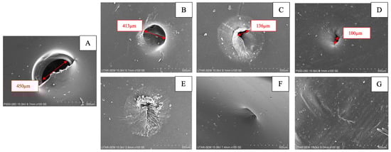 Figure 8. SEM image of (A) a damaged membrane, (B) SPEEK, (C) SP100, (D) SP30, (E) SP20, (F) SP10, and (G) SP0 after healing at 45 °C for 2 days.