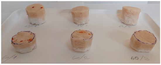 The samples with applied xylan-based surface treatments were depicted in Figure 4, where the sample codes have the following meanings: (43, 60)/(1, 2, 3)—base foam with 43 or 60 °SR beating degree and treatment with native xylan (1), AKD hydrophobized xylan (2), and acetylated xylan (3). The pictures in Figure 4 were acquired just after the xylan spraying procedure.