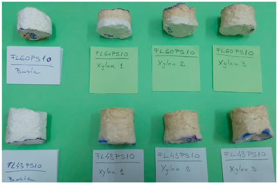 Surface-treated samples were dried on filter paper (in order to take over the possible xylan leakages through samples) at room temperature (approx. 22 °C) for 48 h. Dry-state samples (ready-to-use foams) were presented in Figure 5, where sample codes have the following meanings: FL(43, 60) PS10—Long Fiber with 43 or 60 °SR beating degree, and 4% surfactant (SDS); Xylan (1, 2, 3)—native xylan (1), AKD hydrophobized xylan (2), and acetylated xylan (3). The image within Figure 5 also contains the reference foams (denoted as “Basic”), enabling a comparative analysis between samples with and without surface treatments.