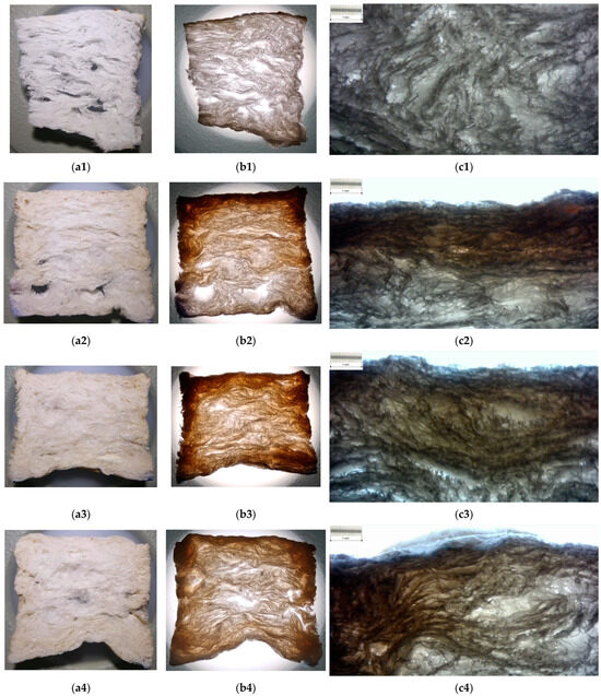 Images of longitudinal sections into samples based on 60 °SR beating degree: (a) photo on reflected light; (b) photo on transmitted light; (c) optical microphotograph of xylan–material interface (transmitted light, etalon scale marked on picture); (1) basic samples without xylan surface treatment; (2) samples with native xylan surface treatment; (3) samples with AKD hydrophobized xylan surface treatment; (4) samples with acetylated xylan surface treatment.