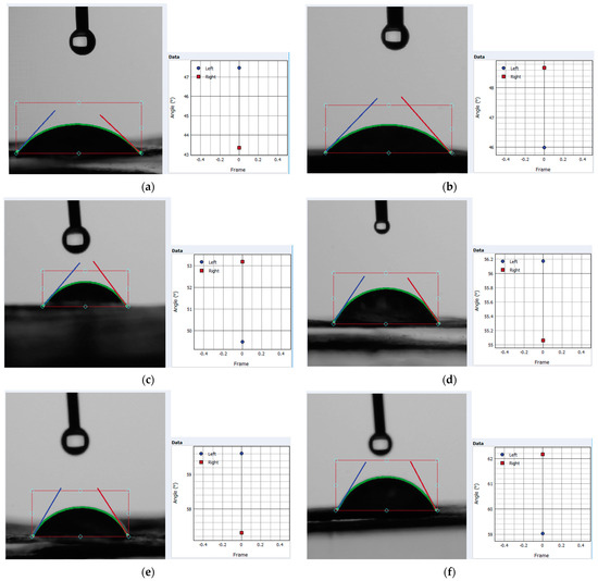 A set of snapshots within the contact angle evaluation procedure is presented in Figure 8, where the droplet on the sample surface can be observed, with marked left/right estimated angles through the image processing with data interpolation correlated procedure) and the angle distribution chart. The significance of each image is mentioned in the figure caption. According to the samples within Figure 8, Table 1 systematically presents values of each angle, average angle, and RMS errors of the estimation procedure (sample codes in Table 1 have the same meaning as those in Figure 5 (see Section 3.1)).
