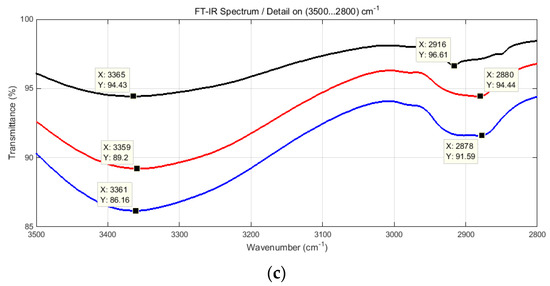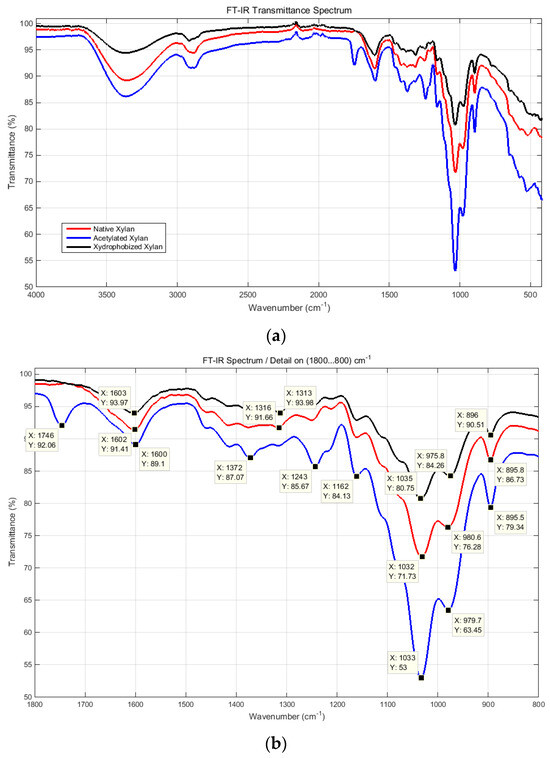 The structural characteristics, which highlight the presence of specific chemical groups in the modified xylan samples, were analyzed using a Nicolet iS50 FT-IR spectrometer (Thermo Scientific, Waltham, MA, USA) equipped with an attenuated total reflection (ATR) accessory and a diamond crystal plate, in transmission mode. The spectrometer was placed in a temperature-controlled room (21 ± 2 °C). Infrared spectra were measured within the spectral range 4000–400 cm−1 at 2 cm−1 spectral resolution and 32 background/sample scans using OMNICTM software (Thermo Fisher Scientific Inc., Waltham, MA, USA). The background spectrum was collected by taking air as a reference before each measurement, and the diamond crystal plate was cleaned with alcohol.