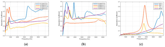 Acoustical absorption coefficient: (a) FL43PS10 basic material; (b) FL60PS10 basic material; (c) reference materials.