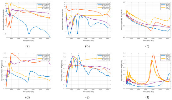 Surface acoustic impedance at normal sound incidence in terms of magnitude and angle: (a) FL43PS10 basic material—impedance magnitude; (b) FL60PS10 basic material—impedance magnitude; (c) reference materials—impedance magnitude; (d) FL43PS10 basic material—impedance angle; (e) FL60PS10 basic material—impedance angle; (f) reference materials—impedance angle.