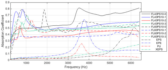 Thus, the group based on FL43PS10 basic material presents the following characteristics: (a) all treatments shift the frequency peak to the lower values (under 1000 Hz) compared with the basic foam sample; (b) all treatments decrease the absorption ability for medium–high frequencies (beyond 2000 Hz), but provide an approximately constant value (α ≅ 0.4–0.6, depending to the treatment type); (c) native xylan presents smallest changings; (d) hydrophobized xylan presents the worst solution because of its major decreasing of absorption ability; (e) acetylated xylan presents a relative constant characteristic (α ≅ 0.45–0.50) for the whole frequency range, and, by demonstrating the better performances related to the wettability, this treatment represents the better solution for this foam type.