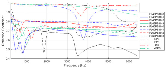 Graphs in Figure 10 present the results related to the acoustic absorption coefficient with respect to the frequency range enabled by the impedance tube. Diagrams were grouped by the basic material, such as 43 and 60 °SR beating degree, and reference petroleum-based materials. In the same manner, the results related to the acoustic reflection coefficient are presented in Figure 11.