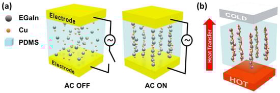 Dielectrophoretic alignment of EGaIn and Cu metal particles in the composites for pad-type TIMs; (a) dispersed EGaIn and Cu conductive fillers in the PDMS matrix with and without alternating current (AC) field; (b) directional heat transfer induced by the linear alignment of the biphasic metal fillers.