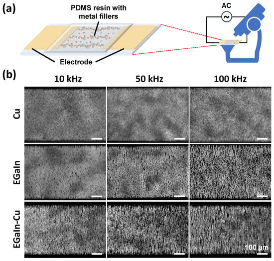 (a) Schematic of experimental observation of the EGaIn and Cu metal particles in the PDMS prepolymer under an AC electric field. (b) Optical microscope images showing the alignment of the metal particles in the PDMS resin. The AC electric field was applied at frequencies of 10, 50, and 100 kHz. The total amount of metal fillers in the PDMS prepolymer was 10 wt.% for all three samples. The ratio of EGaIn and Cu in the EGaIn-Cu sample was 1:1.