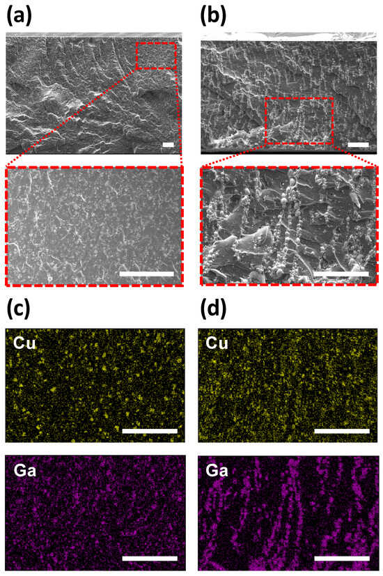 Cross-sectional SEM images and EDS analysis of the 48 wt.% EGaIn-Cu/PDMS TIM (a,c) without and (b,d) with the DEP-C process. Scale bar is 100 μm.