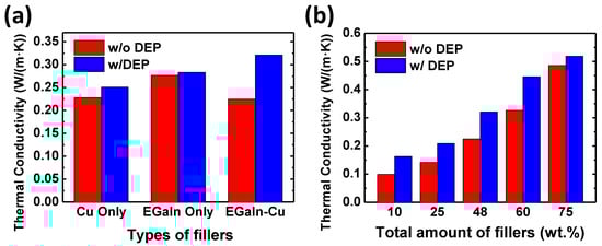 Effect of DEP-C-induced filler alignment on the thermal conductivities of TIM samples with (a) different fillers and (b) different total filler contents. The total filler content in (a) is 48 wt.%. The weight ratio of EGaIn and Cu is 4:1.