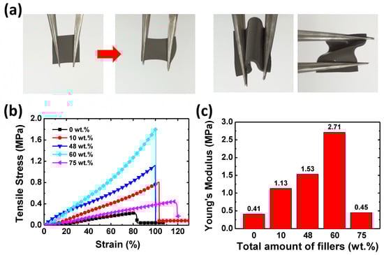 (a) Photographs of the pad-type EGaIn-Cu/PDMS TIM prototypes under mechanical deformation. The filler content is 48 wt.%. The size of the TIM sample is 12 mm × 12 mm, and the thickness is 0.5 mm; (b) strain–stress curve and (c) Young’s modulus of EGaIn-Cu/PDMS TIMs with different filler contents.