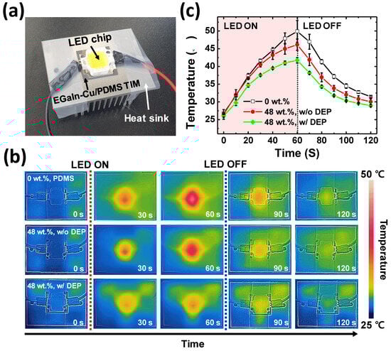 As shown in Figure 9a, the TIM is inserted between the heat sink and the heat source (i.e., LED chip) to demonstrate the heat dissipation performance of the EGaIn-Cu/PDMS TIMs. The temperature change at the top surface of the LED is compared for three different TIM samples with the same size and thickness, namely the pristine PDMS TIM, the EGaIn-Cu/PDMS TIM without the DEP-C process, and the EGaIn-Cu/PDMS TIM with the DEP-C process. Figure 9b describes the result as time-dependent thermal images. The LED stayed on for 60 s before turning off. The LED chip generated heat once it was powered on, causing the temperature of the top surface to rise rapidly. Furthermore, even after the power was turned off, the residual heat did not dissipate immediately but persisted for more than 60 s. The pristine PDMS TIM shows the highest temperature increase; the EGaIn-Cu/PDMS TIM without the DEP-C process demonstrates a slight suppression in the temperature rise; and the EGaIn-Cu/PDMS TIMs with the DEP-C process exhibits the most effective heat dissipation performance with the least temperature increase. The graphs in Figure 9c depict the temperature changes of the LED on the different types of TIMs. The pristine PDMS TIM without fillers demonstrates the sharpest temperature rise, reaching almost 50 °C (92% increase over the initial temperature). The EGaIn-Cu/PDMS TIMs without the DEP-C process show a decrease in temperature change with the maximum temperature of 46 °C at 60 s (77% increase). The EGaIn-Cu/PDMS TIM with the DEP-C process demonstrates the lowest temperature rise to a maximum of 42 °C (62% increase). This thermal performance difference confirms that the enhanced alignment of EGaIn-Cu biphasic metal fillers by the DEP-C process improves the through-plane thermal conductivity of the TIM composite.