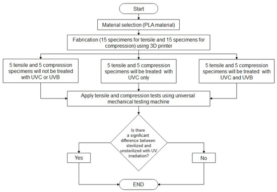 The proposed method is divided into five major sections, as shown in Figure 1. The first is material selection, where the PLA material has been chosen for two reasons: first, it has a reasonable cost, and second, its availability in the market. The PLA material was provided from CREALITY (Shenzhen Creality 3D Technology Co., Shenzhen, China) for use in the 3D printer, and it comes with the following specifications: CR-PLA White, 1.75 mm diameter, 1.0 kg weight, and a recommended printing temperature range of 195–220 °C. The second section describes the fabrication of the specimens using a 3D printer based on the ASTM 638 and ASTM 695 specimen sizes for tensile and compression tests. Thirty specimens were included in this investigation. The specimens were divided into three groups: the first group was not treated with UVC or UVB irradiation; the second group was treated with UVC only; and the third group was treated with UVC and UVB. A mechanical testing machine was used to test the mechanical properties of the PLA before and after UV treatment. Finally, an analysis of variance (ANOVA) was employed to determine whether there was a significant difference between the treated and untreated specimens.
