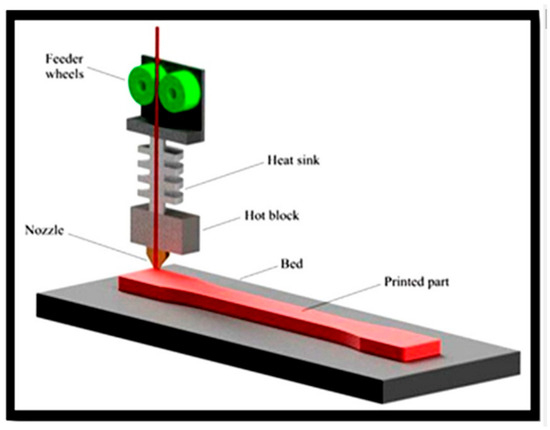 3D printing has numerous applications in various industries, including aerospace, automotive, healthcare, architecture, fashion, and consumer goods. Common applications include rapid prototyping, custom medical implants, architectural models, and the production of intricate components. Figure 2 depicts the FDM process. Fiber deposition printing (FDP) is a well-known technology for creating structural components using polymer filaments with varying characteristics. Polymeric materials with different flexibilities, operating temperatures, and hardness values can also be employed. FDP can use several materials, the most common of which are PLA and ABS. In several investigations, short and long fiber-reinforced thermal polymers were used as feedstock for the FDP method [30,31,32]. In Ref. [32], for example, carbon-fiber-reinforced plastic composite specimens have been created using FDP, carbon fibers, and ABS. FDM was used to 3D-print the samples using a TRONXY X5SA-500PRO machine (Shenzhen Tronxy Technology Co., Ltd, Shenzhen, China). Table 1 and Table 2 provide the filament specifications and qualities, as well as the printing settings.