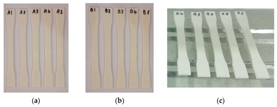Tensile test specimens (ASTM D638): (a) untreated specimens (A1, A2, A3, A4 and A5), (b) treated specimens with UVC (B1, B2, B3, B4 and B5), and (c) treated specimens with UVC and UVB (B6, B7, B8, B9 and B10).