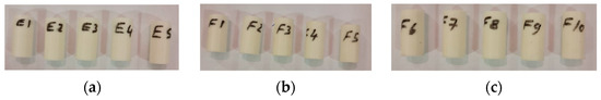 Compression test specimens (ASTM D695): (a) untreated specimens (E1, E2, E3, E4 and E5), (b) specimens treated with UVC (F1, F2, F3, F4 and F5), and (c) specimens treated with UVC and UVB (F6, F7, F8, F9 and F10).