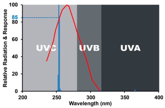 In terms of viral removal, not all UVC wavelengths are equally effective. The degradation of DNA and RNA was detected at approximately 265 nm (red lines). This wavelength is close to the maximum UVC discharge lamp output (254 nm, blue line). As shown in Figure 5, UVC discharge lamps emit approximately 85% of the theoretical maximum germicidal effectiveness [19].