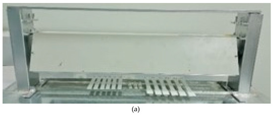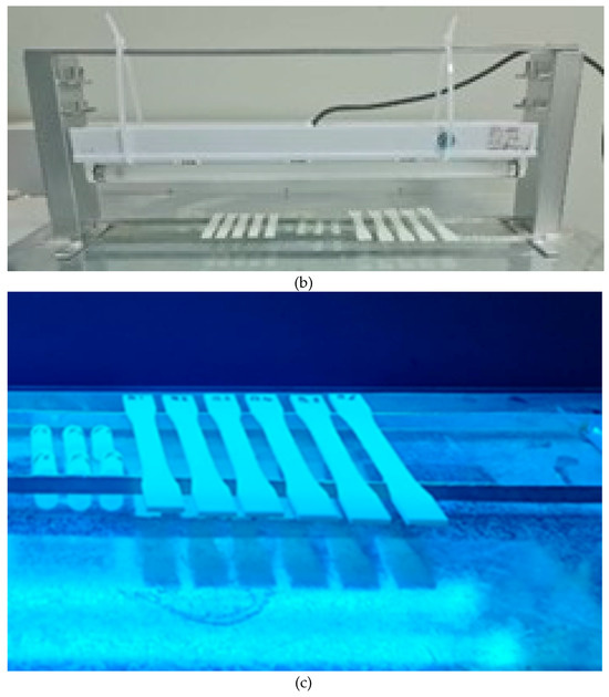 For UV radiation exposure, a locally made box with two 20 W UV lights at a wavelength of 254 nm was used. The container could hold a space of 8–16 cm between the surfaces of the two lamps and the surfaces of the samples. Figure 6a shows a locally made movable cage and irradiation lamps with dimensions of 24 L × 6 W × 4.25 H in (610 × 152 × 108 mm) and a weight of 10 lb (4.5 kg). With the help of a UV radiometer that came with the ILT tools [23], the radiation levels in the entire treated area were recorded. The device allows users to change the lamps, as shown in Figure 6b, which shows another type of UV lamp using a power of 20 W and the same dimensions as the UVC lamps. Figure 6c shows the setup of the samples inside the UV radiation container, where a portable data logger was used to monitor the temperature and humidity during treatment [33].