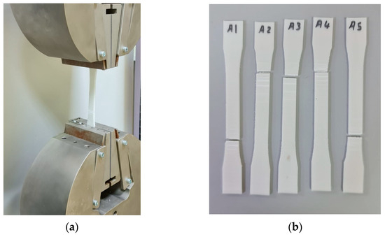 Tensile test: (a) universal testing machine (UTM), (b) untreated tensile specimens (A1, A2, A3, A4 and A5), (c) UVC-treated tensile specimens (B1, B2, B3, B4 and B5), and (d) tensile specimens treated with UVC and UVB (B6, B7, B8, B9 and B10).