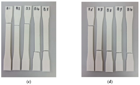 A UTM was used to determine the tensile parameters, such as yield, ultimate, and fracture stresses and forces, for three different groups of tensile specimens based on ASTM D638, as shown in Figure 7a. Figure 7b–d show the tensile specimens before treatment, after UVC treatment, and after UVB and UVC treatment, respectively.