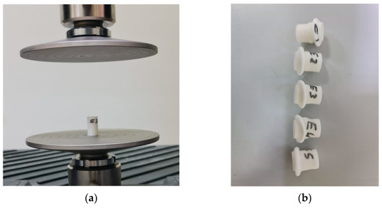 A UTM was used to determine the compression parameters, such as the yield, ultimate, and fracture stresses and forces, for the three different groups of compression specimens based on ASTM D695, as shown in Figure 8a. Figure 8b–d show the compression specimens before treatment, after UVC treatment, and after UVB and UVC treatment, respectively.