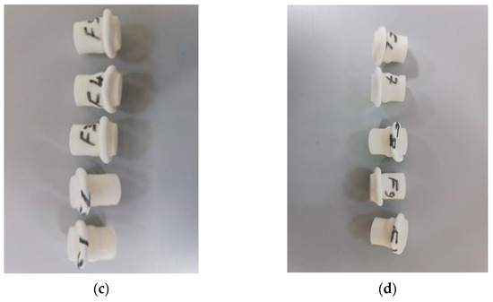 Compression test: (a) UTM, (b) untreated compression specimens with UV (E1, E2, E3, E4 and E5), (c) treated compression specimens with UVC (F1, F2, F3, F4 and F5), and (d) treated compression specimens with UVC and UVB (F6, F7, F8, F9 and F10).