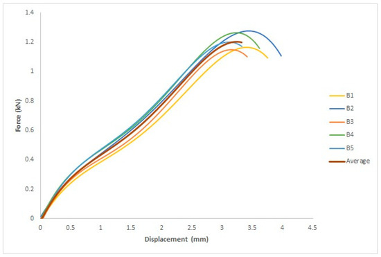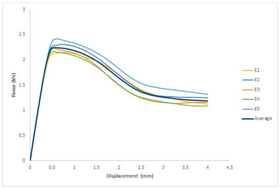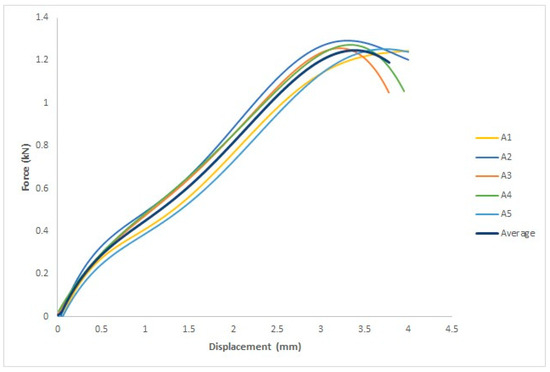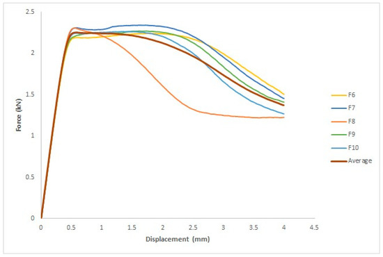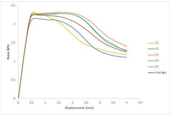 Figure 15 depicts the force–displacement curve for each specimen and the average of the five specimens, where the x-axis represents the displacement in mm and the y-axis represents the force in kN. The ASTM D695 standard was used to measure four parameters: yield force (kN), fracture stress (kN), yield displacement (mm), and fracture displacement (mm).