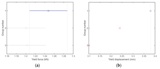 As shown in Figure 12b, there was a significant difference in the yield displacement (mm) between group 1 and the other two groups (p = 1.2372 × 10−23). The y-axis represents the three groups, and the x-axis represents the yield displacement values in (mm).