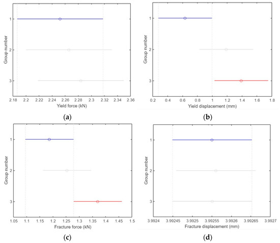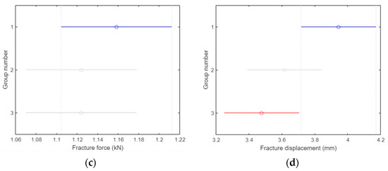 As shown in Figure 17c, there was no significant difference in fracture force (kN) between groups 1 and 2, but there was a clear difference between groups 1 and 2 (p = 0.05).