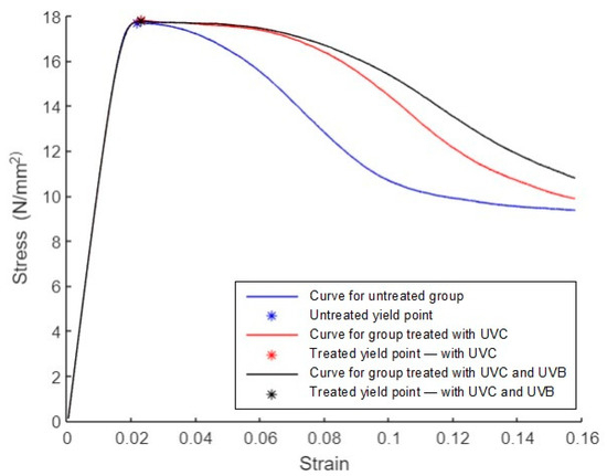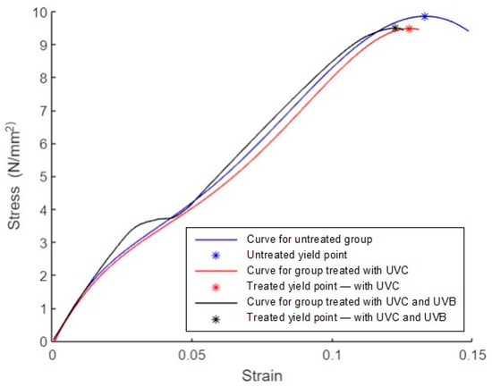 The average curves for groups 1, 2, and 3 are shown in Figure 13. As mentioned in the ASTM D638 standard, the tensile yield point is the first point on the stress–strain diagram where a rise in strain occurs without a rise in stress [11]. The yield points are marked with * symbols. The blue curve corresponds to the untreated group with a yield stress of 9.8 N/mm2, a yield strain of 0.13, a fracture stress of 9.4 N/mm2, and a fracture strain of 0.15. The red curve corresponds to the group treated with UVC irradiation, with a yield stress of 9.5 N/mm2, a yield strain of 0.13, a fracture stress of 9.4 N/mm2, and a fracture strain of 0.13. The black curve corresponds to the group treated with UVC and UVB irradiation, with a yield stress of 9.5 N/mm2, a yield strain of 0.12, a fracture stress of 9.4 N/mm2, and a fracture strain of 0.13.
