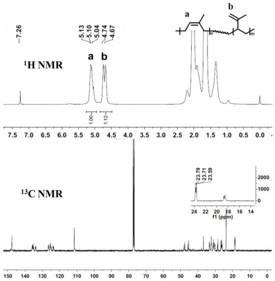 1H and 13C NMR spectra of the representative sample of polyisoprene obtained at [Co]/[AlEt2Cl] = 1/10 (Table 2, entry 2). 1H NMR of the 1,4 =CH signals at a and the 3,4 =CH2 signal at b.