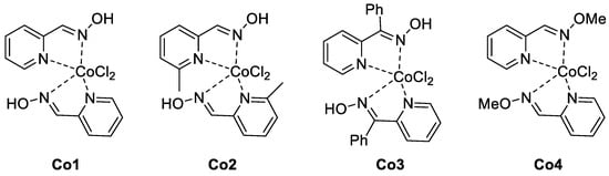 The Co(II) complexes were synthesized by the prepared ligands coordinating with cobalt chloride in anhydrous CH2Cl2 under argon atmosphere to provide the targeted complexes Co1–Co4 with high yields. All the cobalt complexes performed well in characterization analysis, including ATR-IR, high resolution mass spectroscopies and elemental analysis (Scheme 1). Single crystals of complex Co2 were obtained by diffusing hexane into its saturated dichloromethane solution at −30 °C in glovebox, and have been deposited in CCDC with codes number of 2160527. As seen in the structure shown in Figure 1 and Tables S1–S3, the Co2 complex adopted a distorted octahedron coordination geometry surrounded by two L2 ligands and one CoCl2 molecule, wherein two Npyridine atoms (N1 and N3) and two chloride atoms formed the basal equatorial plane and the angle of the axis N2-Co-N4 is 172.1°. Moreover, the Noxime atoms of each ligand have a stronger coordination than Npyridine at the cobalt center according to the bond lengths [Co–N1 = 2.188(17), Co–N2 = 2.098(16), Co–N3 = 2.219(16), Co–N4 = 2.132(16)]. Consistent with the previous work of pyridine–oxime iron complex [65], the oxime proton is unionized.