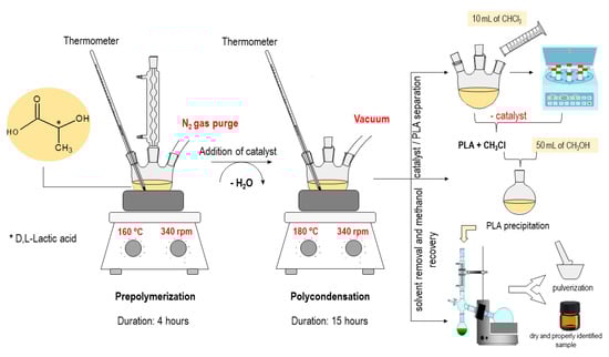 Poly(lactic acid) (PLA) was synthesized through direct polycondensation of D,L-lactic acid, employing a commercial silica-alumina catalyst (Sigma-Aldrich, USA, SiO2/Al2O3 mole ratio = 12.4), which was activated to a protonic form after treatment at 550 °C for 8 h. The synthesis process comprises two steps: pre-polymerization and catalytic polycondensation. In the pre-polymerization stage, water is removed from a system containing D,L-lactic acid (85%, Vetec, Rio de Janeiro, Brazil) by heating the mixture to 160 °C, which is subjected to magnetic stirring at 340 rpm and undergoes distillation under N2 gas flow for 4 h. Then, the temperature is elevated to 180 °C, and the catalyst is introduced into the reaction medium. The distillation apparatus is then disassembled, and a vacuum hose is connected to the system, which is subsequently sealed hermetically and maintained in this state for an additional 15 h. Following the polycondensation, the catalyst is separated, and the polymer is crystallized through the addition of methanol. Ultimately, methanol and chloroform are eliminated through rotary evaporation. The polymer is then removed from the inner surfaces of the flask and pulverized using a mortar and pestle until it reaches a thoroughly dry PLA powder. For the purpose of comparison, a pre-polymer sample and PLA without the use of a catalyst were synthesized. Additionally, three PLA samples were obtained using the catalytic polycondensation method, employing silica-alumina as the catalyst, and they were named PLA 1X, PLA 2X, and PLA 3X. The detailed procedure has been described in references [,]. Figure 1 schematically outlines the aforementioned process.