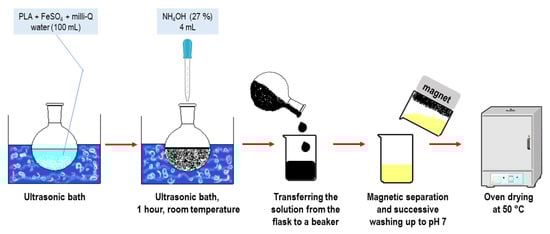 The sonochemical synthesis of MNP-Fe3O4/PLA nanocomposites was conducted by adding first PLA (synthesized in our laboratory) followed by ferrous sulfate (FeSO4·7H2O, Vetec, Rio de Janeiro, Brazil) to a round-bottom flask containing 100 mL of milli-Q water (Merck Millipore, model Direct 8, Guyancourt, France). The flask was placed in an ultrasonic bath (SolidSteel, model SSBuc-6L, São Paulo, Brazil, operating at 40 kHz) at room temperature (25 °C). The loadings were 20 and 35 wt.% of Fe3O4. For the preparation of 1 g of the composite, it was used 0.40 g of ferrous sulfate and 0.80 g of PLA; 0.70 g of ferrous sulfate and 0.65 g of PLA to obtain 20% and 35% MNP-Fe3O4/PLA nanocomposites, respectively. Subsequently, 4 mL of aqueous ammonia solution (27 wt.%, Merck, São Paulo, Brazil) was added dropwise into this mixture of PLA and ferrous sulfate. Upon the addition of ammonia, a black precipitate of magnetite was visibly formed. The reaction was allowed to proceed for 1 h under ultrasonic radiation. After that, the suspension was transferred to a beaker, and the nanocomposite was isolated via magnetic separation using a neodymium magnet. These nanoparticles were successively rinsed with milli-Q water until the pH reached 7 and subsequently dried in an oven (Ethik, model 400, São Paulo, Brazil) at 50 °C. Each synthesis was repeated three times, and the average yield was 60 to 65%, based on the expected mass of PLA plus magnetite. The process is schematically depicted in Figure 2.
