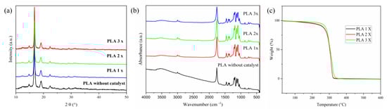 The X-ray diffraction (XRD) patterns of PLA samples (Figure 3a) are representative of either PLLA or PDLA crystalline structures. The semicrystalline pattern obtained for PLA was observed in the polymers synthesized with the silica-alumina catalyst, demonstrating an enantioselective character of the catalyst, as already discussed in the references [,]. The diffraction peaks observed at 2θ values of 14.7°, 16.6°, 19.1°, and 22.3° are indicative of PLLA homocrystals, whereas the peaks at 12.4° and 29.1° are characteristic of stereocomplex crystals (sc) [,,,,,]. These results are corroborated by polarimetry, which suggests an enantiomeric excess of 86% of the L-isomer in the PLA sample []. Specifically, the peaks at 2θ = 16.6° and 19.1° correspond to the hkl planes (110/200) and (203), respectively. Similarly, the peaks at 2θ = 14.8° and 22.3° can be ascribed to the hkl planes (010) and (015), respectively [].