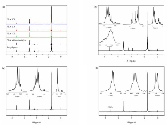 ¹H NMR spectra of the samples: (a) pre-polymer; PLA without catalyst; PLA samples synthesized using silica-alumina catalyst. (b) ¹H NMR spectrum of the pre-polymer PLA. (c) PLA is synthesized without a catalyst. (d) PLA synthesized using a silica-alumina catalyst (sample 3X).