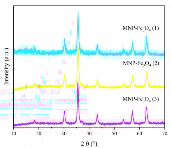 The crystalline structure of MNP-Fe3O4 samples was examined by powder XRD (Figure 5). The obtained patterns displayed a high level of agreement with the crystallographic data of magnetite (PDF number 01-71-6337, ICDD). It can be numbered six characteristic peaks at 2θ = 30.27° (220); 35.71° (311); 43.44° (400); 53.91° (422); 57.36° (511); and 62.96° (440) for the MNP-Fe3O4. Clearly, the three patterns show the high reproducibility of the synthetic method.
