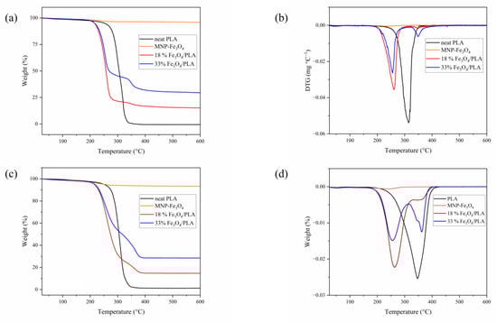 TG (a) and DTG (b) curves of pure PLA, MNP-Fe3O4, and composites of 18% and 33% MNP-Fe3O4/PLA, obtained under N2 atmosphere. TG (c) and DTG (d) curves of pure PLA, MNP-Fe3O4, and composites of 18% and 33% MNP-Fe3O4/PLA, obtained under synthetic air.