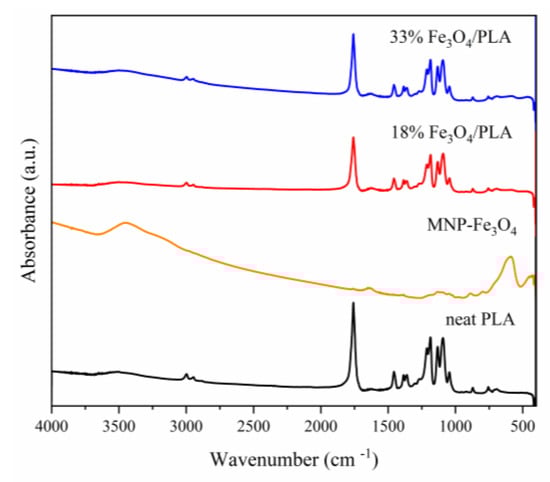 FT-IR spectra of the samples: PLA, MNP-Fe3O4, and MNP-Fe3O4/PLA composites in the proportions of 18% and 33%, respectively.