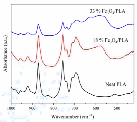 To emphasize the Fe–O bands, the FT-IR pellets were prepared with higher concentrations, specifically between 10% and 20% of the sample mass relative to KBr. The resulting spectra are depicted in Figure 8. As anticipated, the presence of Fe–O stretching bands was confirmed. These bands appeared broader and exhibited shifts compared to the pure magnetite sample, indicating interactions between the Fe–O functional group and the polymer’s functional groups. The Fe–O vibration, originally observed at 441 cm−1 in pure magnetite, shifts to 471 cm−1 and 462 cm−1 in the 18% MNP-Fe3O4/PLA and 33% MNP-Fe3O4/PLA composites, respectively. Furthermore, the band at 591 cm−1, which corresponds to Fe–O stretching in magnetite, was shifted to lower wavenumbers, i.e., specifically to 581 cm−1 and 585 cm−1 in the 18% and 33% MNP-Fe3O4/PLA composites, respectively. These shifts corroborate the interaction between MNP-Fe3O4 and PLA.
