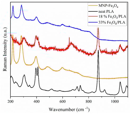 Raman spectra (1200–200 cm-1) of pure PLA, MNP-Fe3O4, 18% MNP-Fe3O4/PLA, and 33% MNP-Fe3O4/PLA samples were obtained with a 795 nm laser and 90 mW of power.