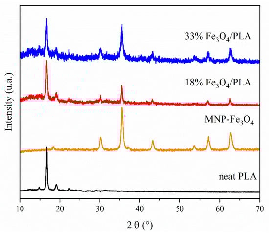 XRD patterns of the samples: pure PLA, MNP-Fe3O4, and MNP-Fe3O4/PLA composites with 18% and 33% loadings.