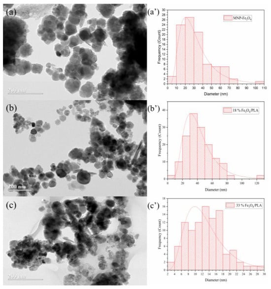 TEM micrographs of the samples: (a) MNP-Fe3O4; (b) 18% MNP-Fe3O4/PLA; and (c) 33% MNP-Fe3O4/PLA, and their corresponding particle size distribution histograms (a′–c′).