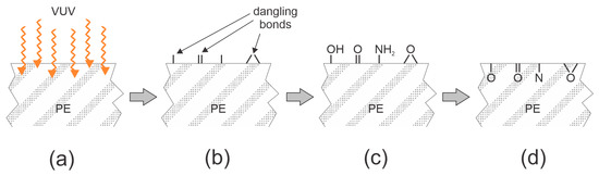 The method disclosed by Truica-Marasescu et al. [30,31] is illustrated in Figure 3. The photon energy from krypton excimers (Kr2*) peaks at 8.5 eV [32], which is more than any bond in polyethylene. The photons are absorbed in a very thin surface film [7] through bond scission (Figure 3a), so dangling bonds appear on the polymer surface (Figure 3b). The dangling bonds interact with gaseous molecules and form polar functional groups (Figure 3c). The large surface concentration will cause spontaneous reorientation of the functional groups and/or diffusion of O atoms into the sub-surface film, so the hydrophobic recovery is rapid (Figure 3d). Although the authors performed treatment in ammonia, there is always some water vapor in the residual atmosphere of vacuum systems, so the large concentration of O-rich surface functional groups is explained by the interaction of water molecules from the residual atmosphere with the dangling bonds.