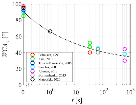 The WCA reported in different articles of PE samples after plasma treatment versus the plasma treatment time. The dotted curve is for eye guidance. References: [28,29,30,34,36,38,40].