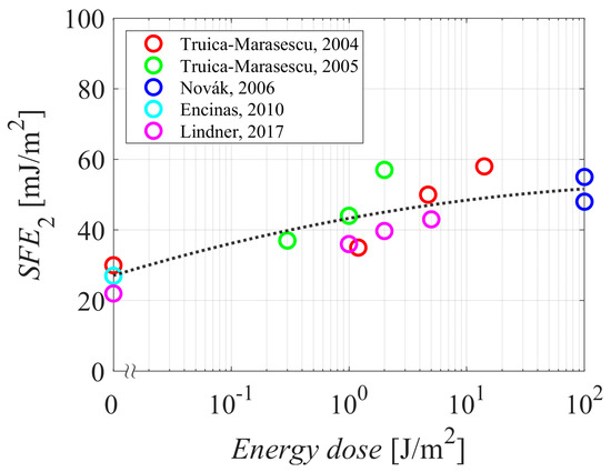 The SFE of PE samples after plasma treatment versus the energy dose. The dotted curve is for eye guidance. References: [30,31,33,35,39].