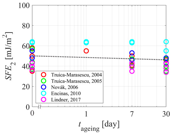 The SFE versus the aging time. The dotted curve is for eye guidance. References: [30,31,33,35,39].