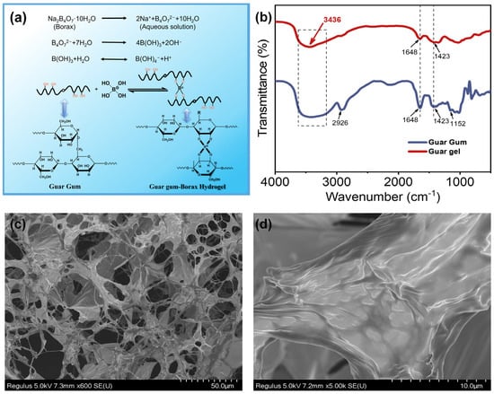 (a) Interaction between borax and guar gum; (b) FTIR spectra of guar gum and guar gel; (c,d) SEM images of the freeze-dried guar gel.