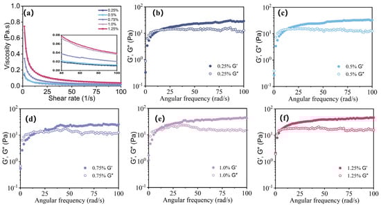 (a) Shear rate dependence of viscosity for AKD emulsion—0.25%, AKD emulsion—0.5%, AKD emulsion—0.75%, AKD emulsion—1.0%, and AKD emulsion—1.25%. (b–f) Dynamic frequency sweep of AKD emulsion—0.25%, AKD emulsion—0.5%, AKD emulsion—0.75%, AKD emulsion—1.0%, and AKD emulsion—1.25%.